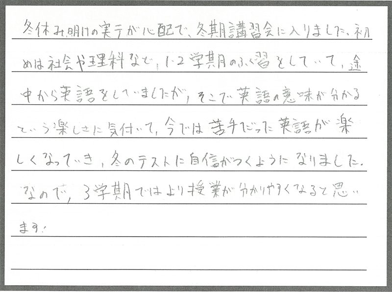 冬休み明けの実テが心配で、冬期講習会に入りました。初めは社会や理科など、1・2学期の復習をしていて、途中から英語をしていましたが、そこで英語の意味が分かるという楽しさに気付いて、今では苦手だった英語が楽しくなっていき、冬のテストに自信がつくようになりました。