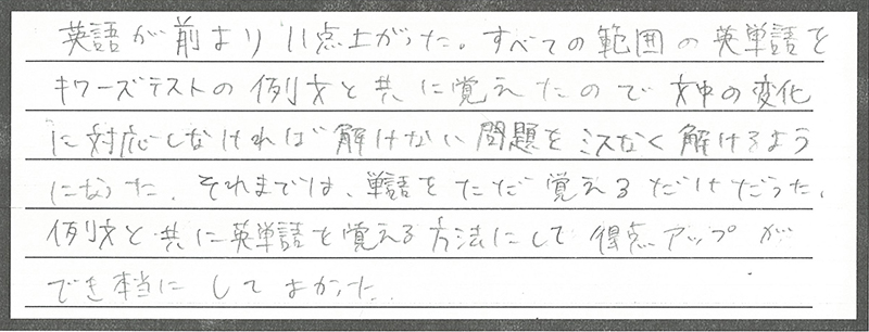 英語が前より11点上がった。すべての範囲の英単語をキワーズテストの例文と共に覚えたので、文中の変化