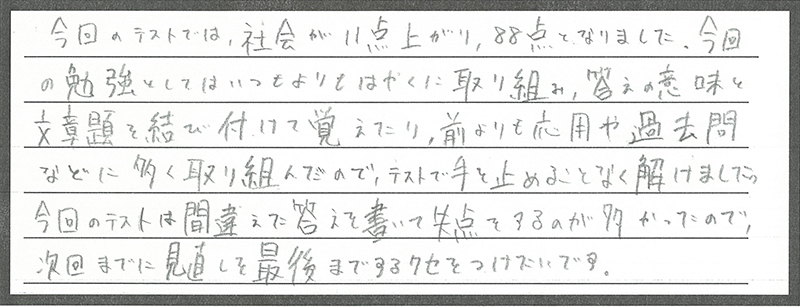 今回のテストでは、社会が11点上がり、88点となりました。今回の勉強としてはいつもよりはやくに取り組み、答えの意味とを文章題を結び付けて覚えたり、前よりも応用や過去問などにも多く取り組んだので、テストで手を止めることなく解けました。