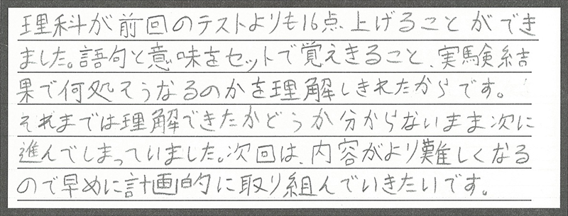 理科が前回のテストよりも16点上げることができました。語句と意味をセットで覚えきること、実験結果で何故そうなるのかを理解しきれたからです。
