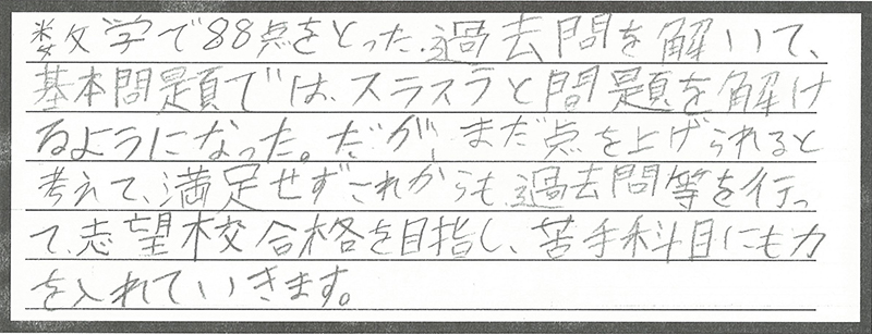 考えて、満足せずこれからも、過去問等を行って志望校合格を目指し、苦手科目にも力を入れていきます。