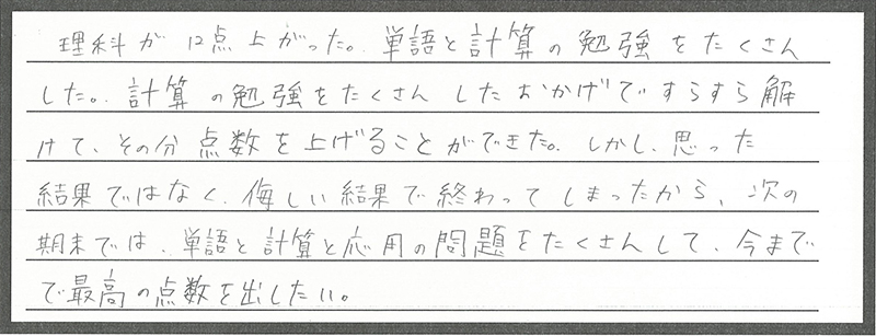 理科が12点上がった。単語と計算の勉強をたくさんした。計算の勉強をたくさんしたおかげですらすら解けて、その分点数を上げることができた。しかし、思った結果ではなく、悔しい結果で終わってしまったから、次の期末では、単語と計算と応用の問題をたくさんして、今までで最高の点数を出したい。